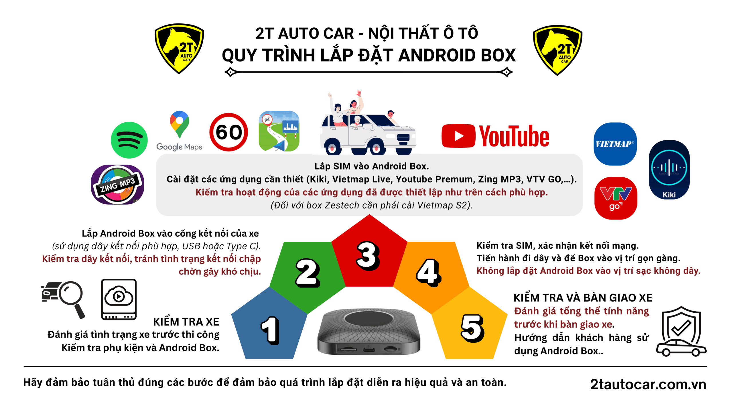 Với hơn 9 cơ sở trải dài từ TP.HCM đến Hà Nội, 2T AUTO CAR tự hào là địa chỉ tin cậy chuyên cung cấp và lắp đặt Android Box ô tô chính hãng của Vietmap, Zestech và Winca.