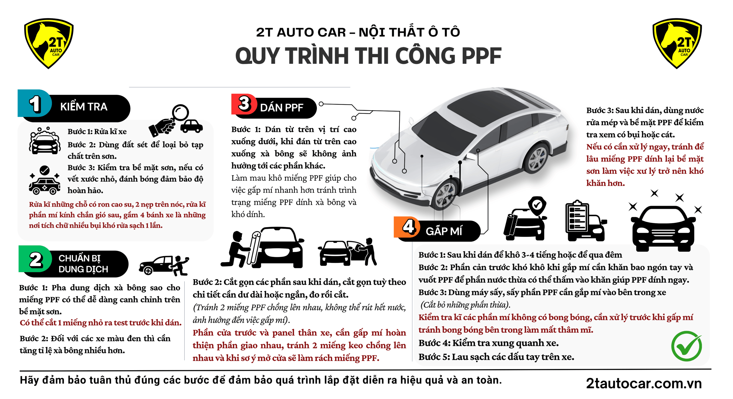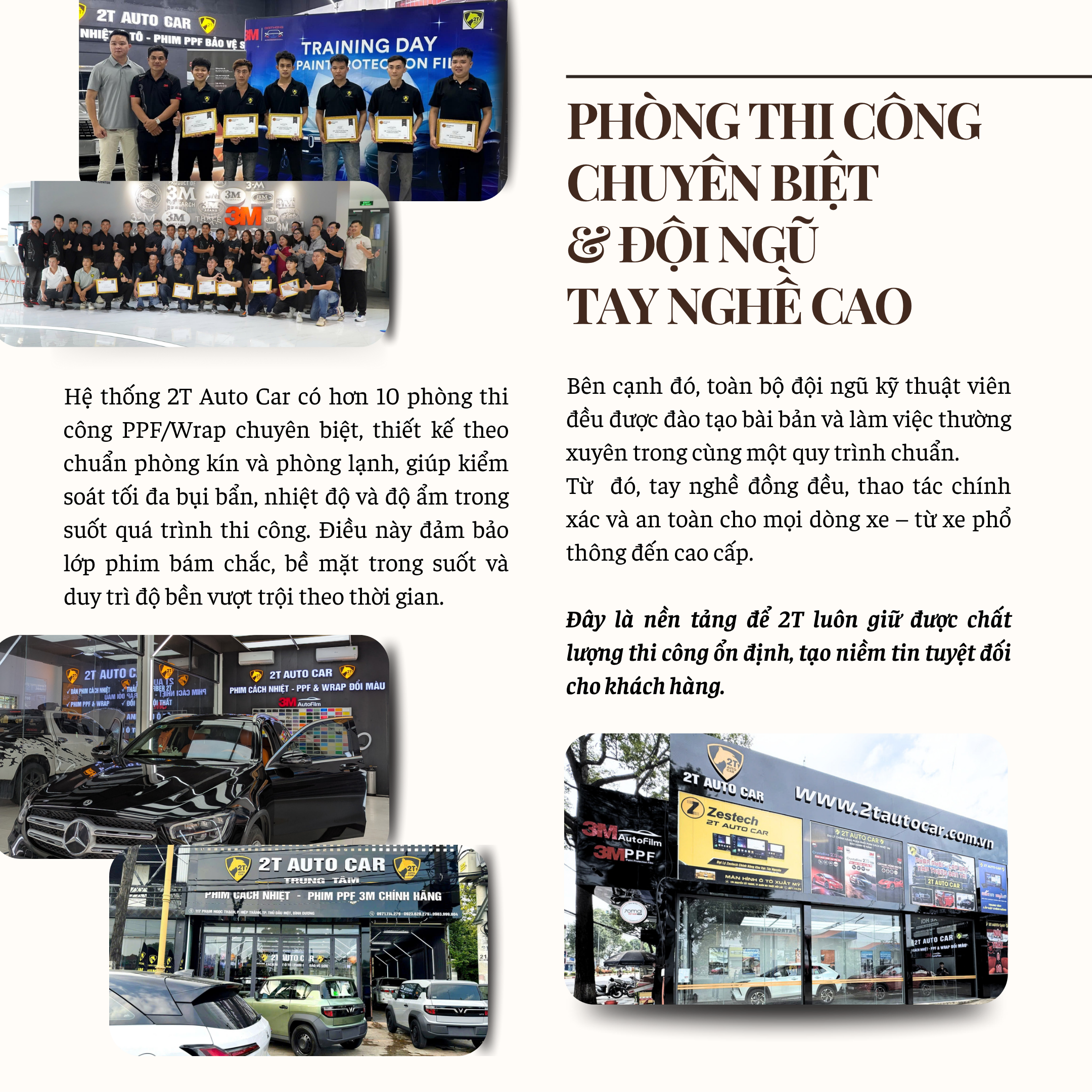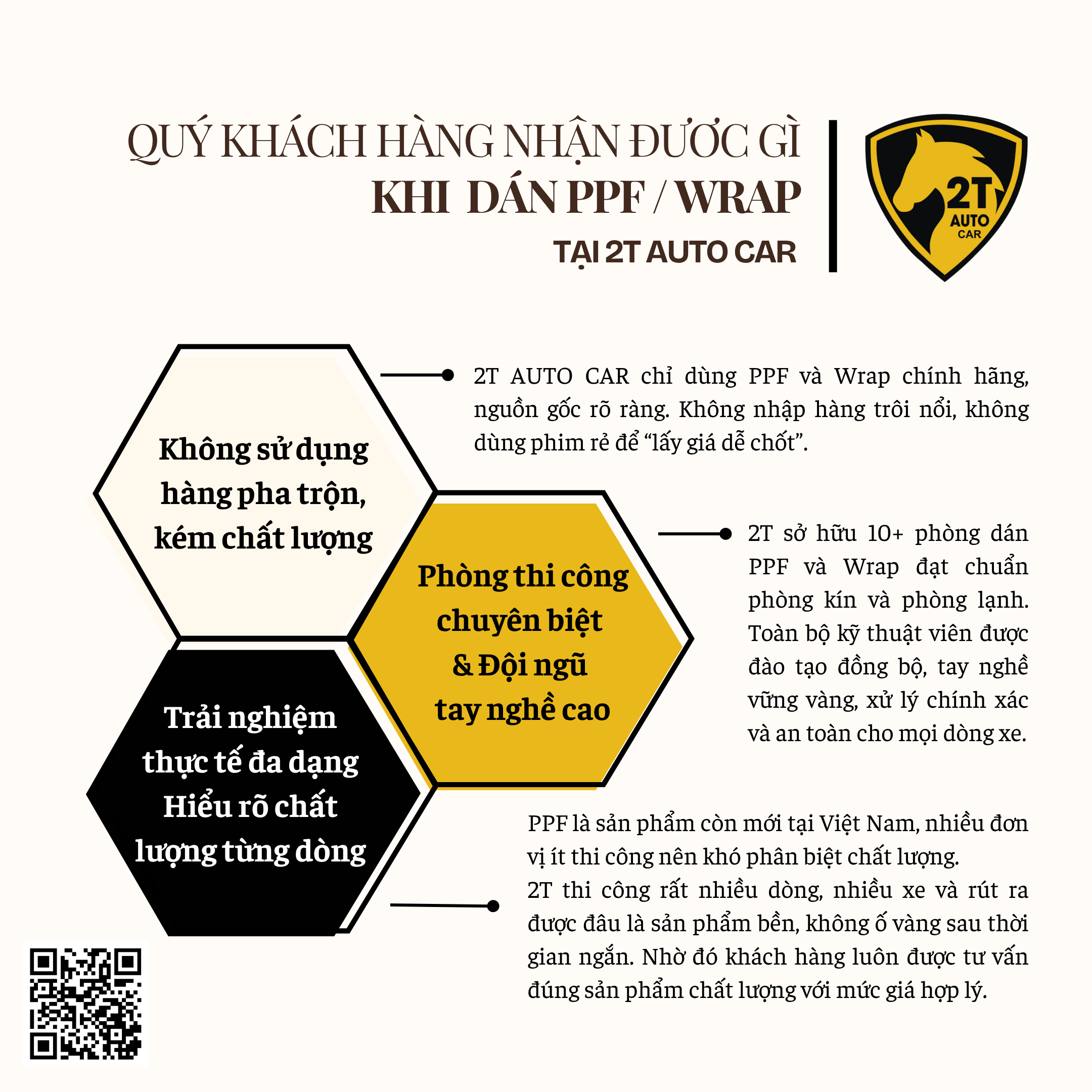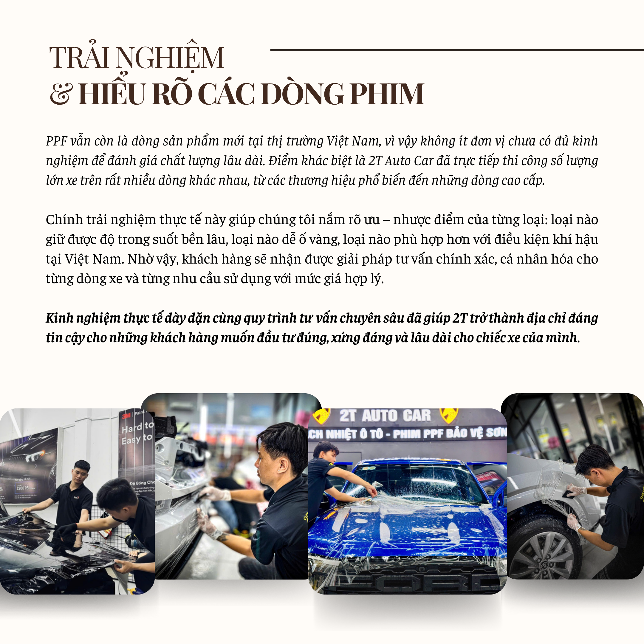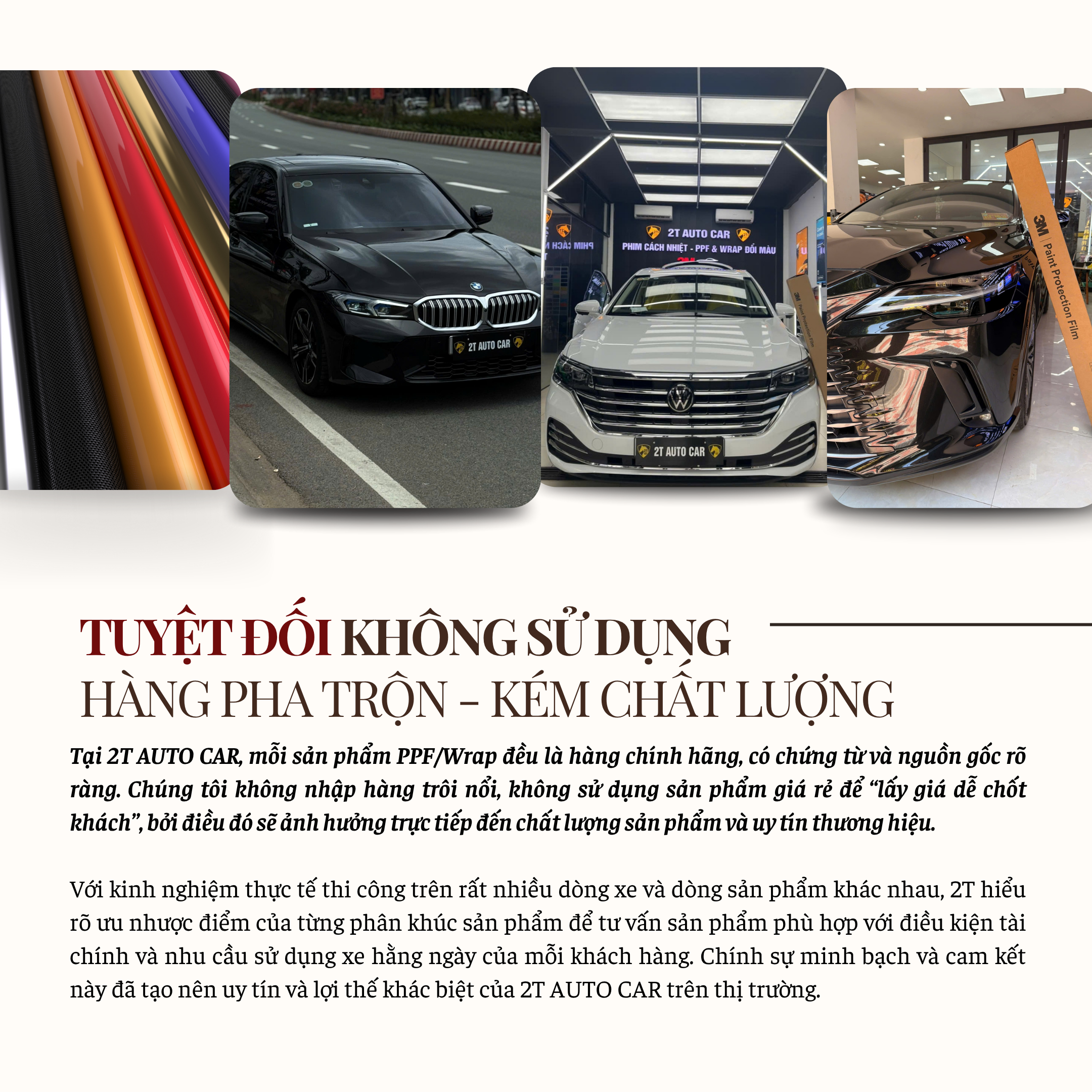 Dán PPF cho ô tô không chỉ đơn thuần là bảo vệ sơn xe, mà còn là cách khẳng định sự chăm sóc tỉ mỉ và đẳng cấp của chủ nhân. Tại 2T AUTO CAR, bạn sẽ được tư vấn lựa chọn sản phẩm PPF phù hợp nhất với nhu cầu và ngân sách, đảm bảo hiệu quả tối ưu, thẩm mỹ hoàn hảo.